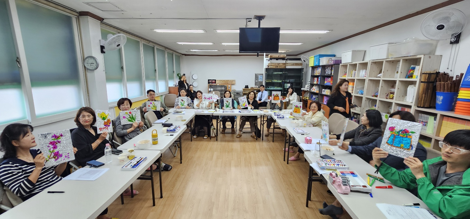 ▲사진=치매인식개선교육협회 프로그램 체험 후 수강자들이 작품을 선보이고 있다.ⓒ강남 소비자저널