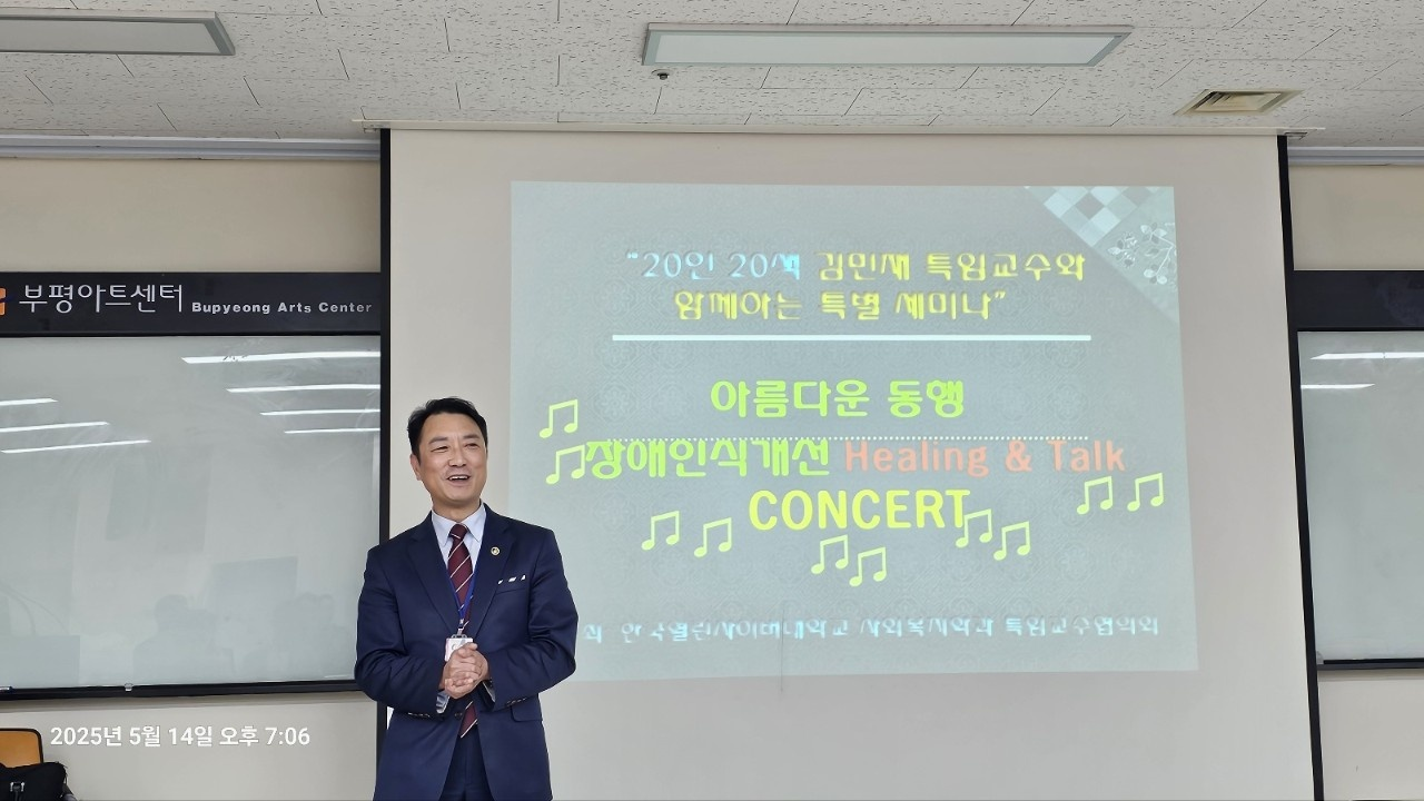 이번 행사는 단순한 강의를 넘어, 지역사회와 재학생이 함께하는 실천적 배움의 장으로 기획되어 큰 호응을 얻었다. 특히 ‘20인20색’이라는 주제 아래 열린 이번 특강은 김민재 특임교수와 함께하는 특별 세미나로, 장애인식개선을 주제로 한 Healing & Talk Concert 형식으로 진행돼 참가자들의 깊은 공감을 이끌어 냈다.