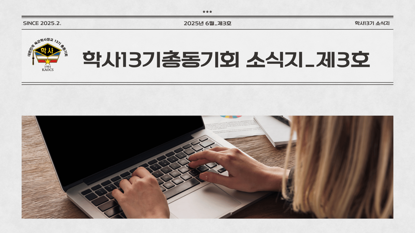 육군학사장교13기총동기회 소식지_제3호 2025년 06월 25일2025년 11월 01일 김은정전체기사 13기 소식지 3호 발간 회장단 동향 학사장교13기 회장배 골프대회 훈육대 소식 외 지역동기회 소식 동호회 활동 기고/칼럼/시 기업/강연/기타 발전기금 애/경사·영전 등 좋은 소식 도서소개 반갑다 동기야!!! 추억의 장소 행복한 시간들 경리장교회 단합대회 학사13기총동기회 소식지 3호가 발간됐습니다.많은 관심과 사랑 부탁드립니다.※ 소식지 내용은 각 단톡을 참조했음을 알려드리며, 틀린 부분은 언제든 수정 가능합니다.