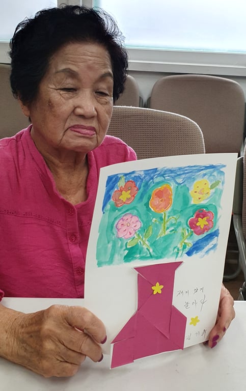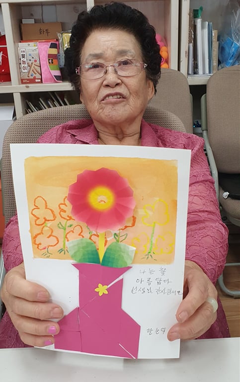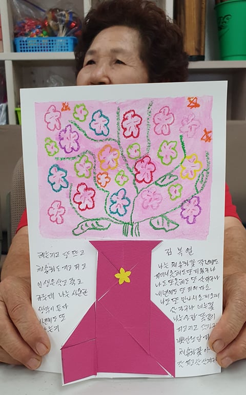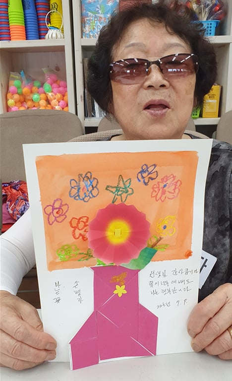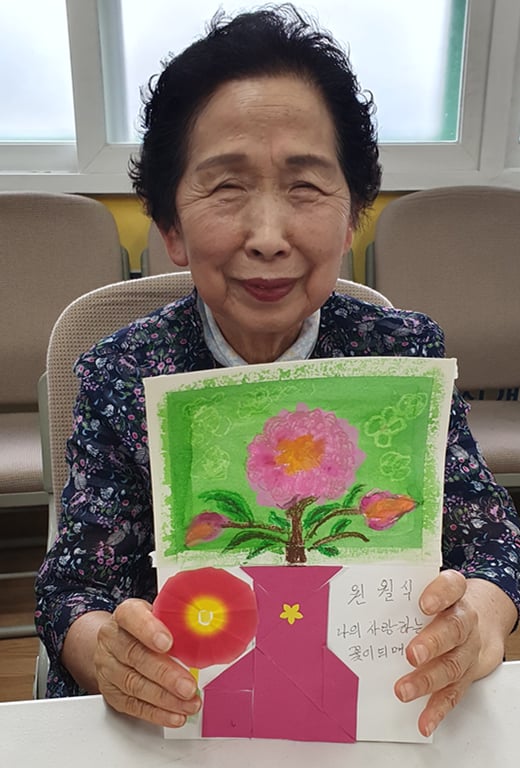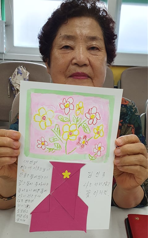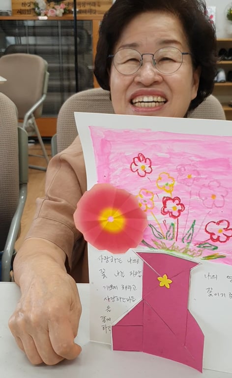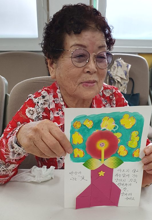 어르신들은 자신만의 꽃을 표현한 작품 위에, 스스로에게 해주고 싶은 말을 글로 써보세요.”라는 제안에 담긴 진심이 어르신들의 마음을 움직였고, 그 결과물들은 하나하나가 감동적인 이야기였다.