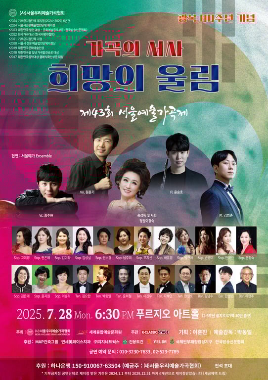 2025년, 대한민국 광복 80주년을 맞아 열린 제43회 서울예술가곡제. ‘가곡의 서사, 희망의 울림’을 주제로, 한국 근현대사를 관통한 가곡 100년을 시대 순으로 엮어 무대에 올린다.