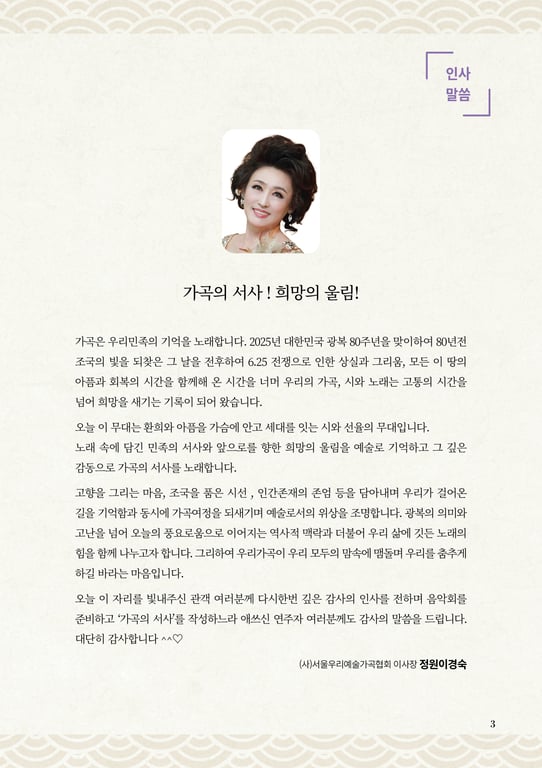 이번 공연은 사단법인 서울우리예술가곡협회 주최로 우리 민족의 정서와 기억을 노래로, 되짚는 감성의 연대기이자 서사적 무대이다.