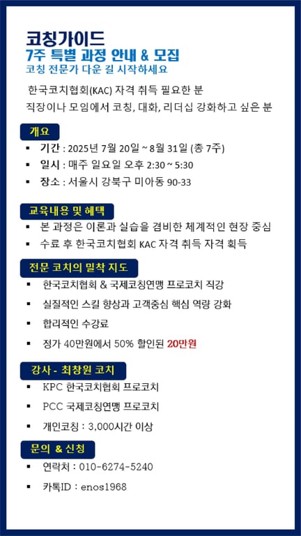 최창원 코치는 KPC 한국코치협회 프로코치 뿐 아니라 PCC 국제코칭연맹 프로코치로 활동하며 개인코칭을 포함하면 3,000시간 이상 코칭 교육을 한 베테랑 프로다.