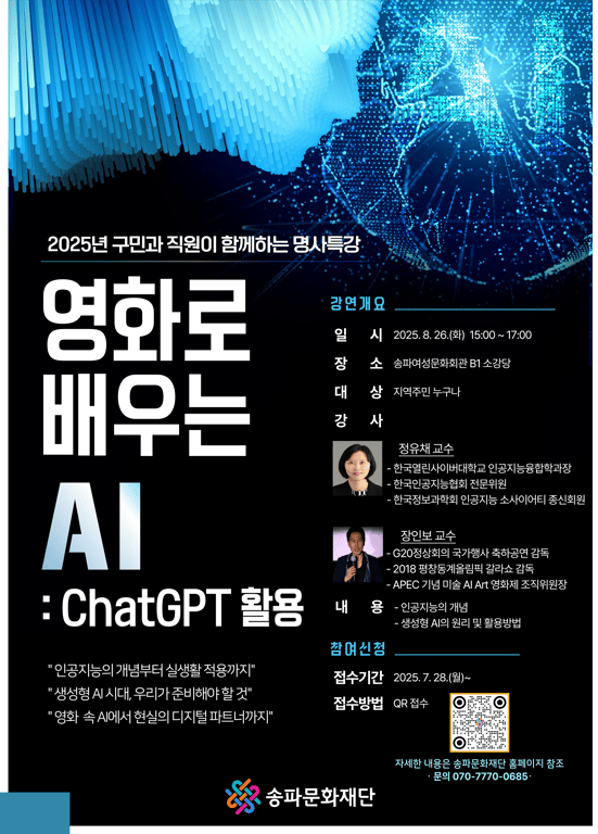 송파구(구청장 서강석)가 인공지능(AI)을 주제로 한 특별한 명사 특강을 마련했다. 오는 8월 26일 송파여성문화회관에서 개최되는 이번 특강은 정유채 교수와 장인보 AI융합센터장이 강연자로 나서 영화 속 친숙한 사례를 통해 AI의 개념을 쉽게 풀어낼 예정이다.