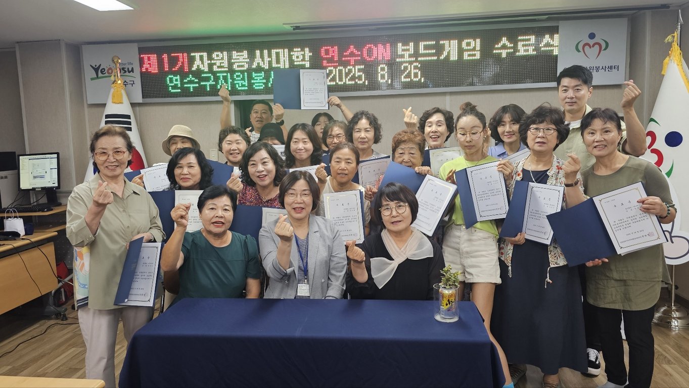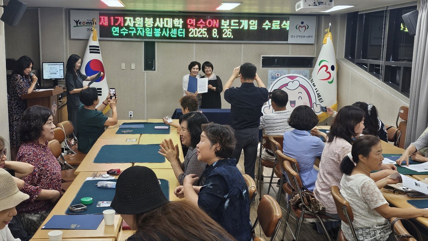 인천광역시 연수구자원봉사센터는 지난 26일 ‘제1기 자원봉사대학 연수ON 보드게임’ 4차 교육과정의 마지막 수업과 함께 수료식을 개최했다. 이번 과정은 지난 8월 5일 시작해 총 4회차에 걸쳐 진행됐으며, 35명의 수강생이 성실히 참여해 수료증을 받았다.