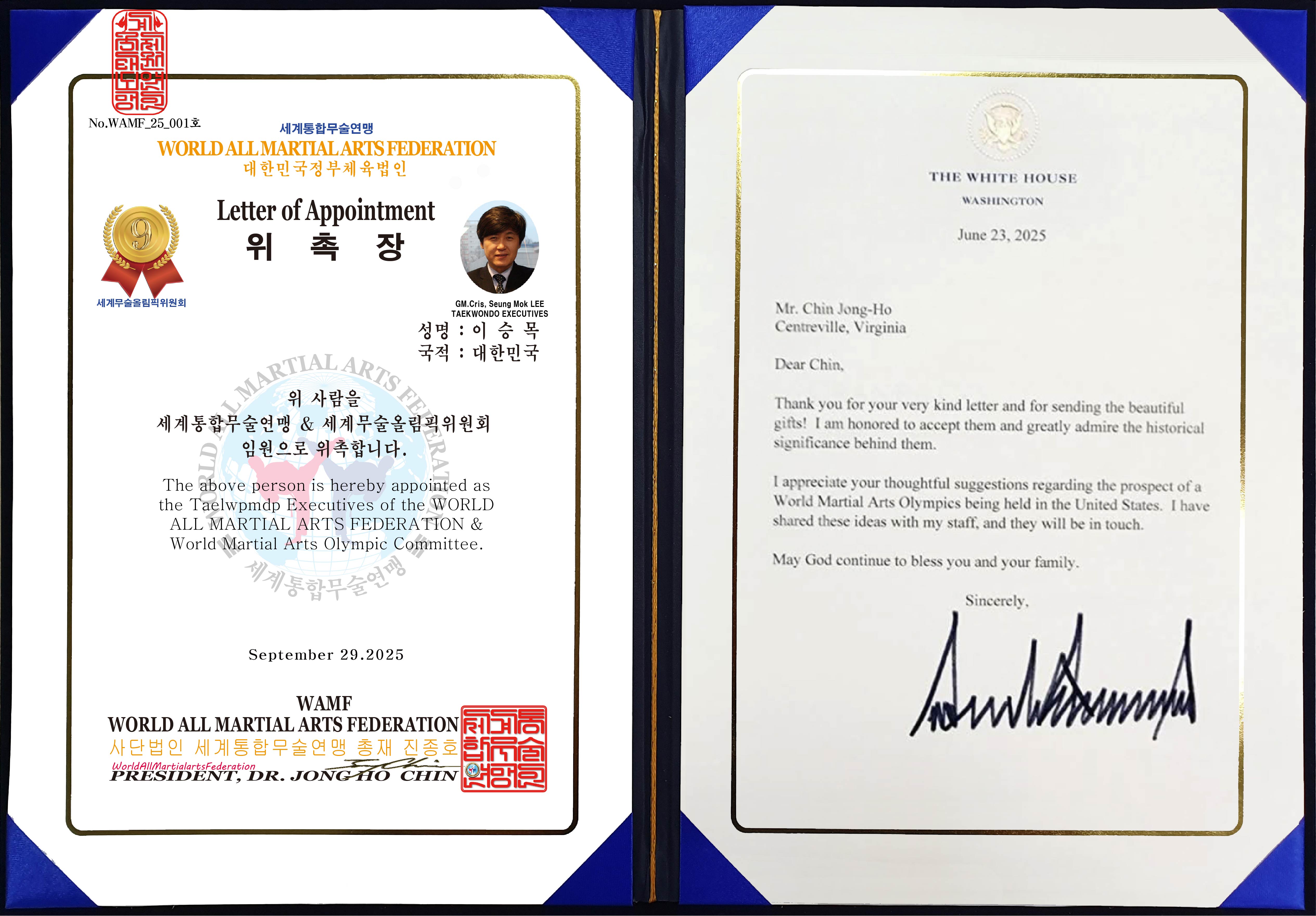 ▲사진=세계무술올림픽위원회 임명장과 세계무술올림픽 명예위원장을 수락한 도날드 트럼프 대통령의 친서와 싸인 ⓒ강남 소비자저널