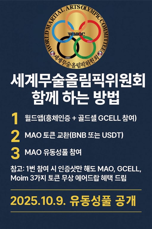 세계무술올림픽위원회(위원장 진종호 세계통합무술연맹 총재, 명예위원장 도널드트럼프 미 대통령)는 세계통합무술연맹 및 ESM소비자평가단과 협력하여 오는 10월 9일 0시(KST)를 기점으로 공식 토큰 MAO(Martial Arts Olympics)의 PancakeSwap 유동성풀(Liquidity Pool)을 전격 공개한다고 밝혔다.