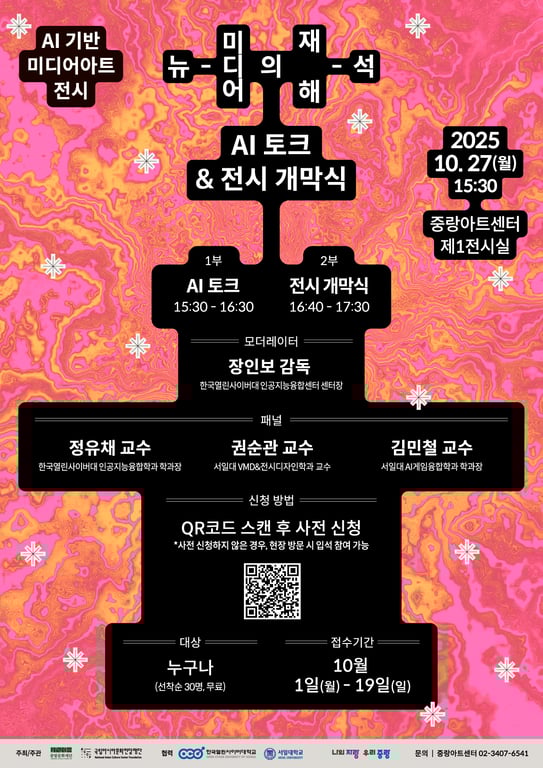 중랑문화재단은 오는 10월 27일(월) 오후 3시 30분, 중랑아트센터 제1전시실에서 AI 기반 미디어아트 전시 《뉴-미디어의 재해-석》을 개최한다. 이번 전시는 개막을 기념하여 ‘AI와 예술의 현재와 미래’를 주제로 한 전문가 토크와 개막식을 함께 진행하며 관람객들을 맞이할 예정이다.