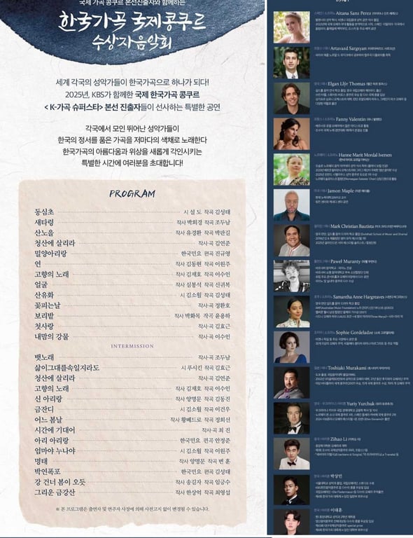 무엇보다 인상 깊었던 건, 세계 각국 성악가들이 각자의 개성으로 풀어낸 한국가곡의 다채로움이었다. 같은 〈보리밭〉이라도 음색과 호흡, 감정의 결이 달랐고, 그 차이가 오히려 노래의 깊이를 더했다.