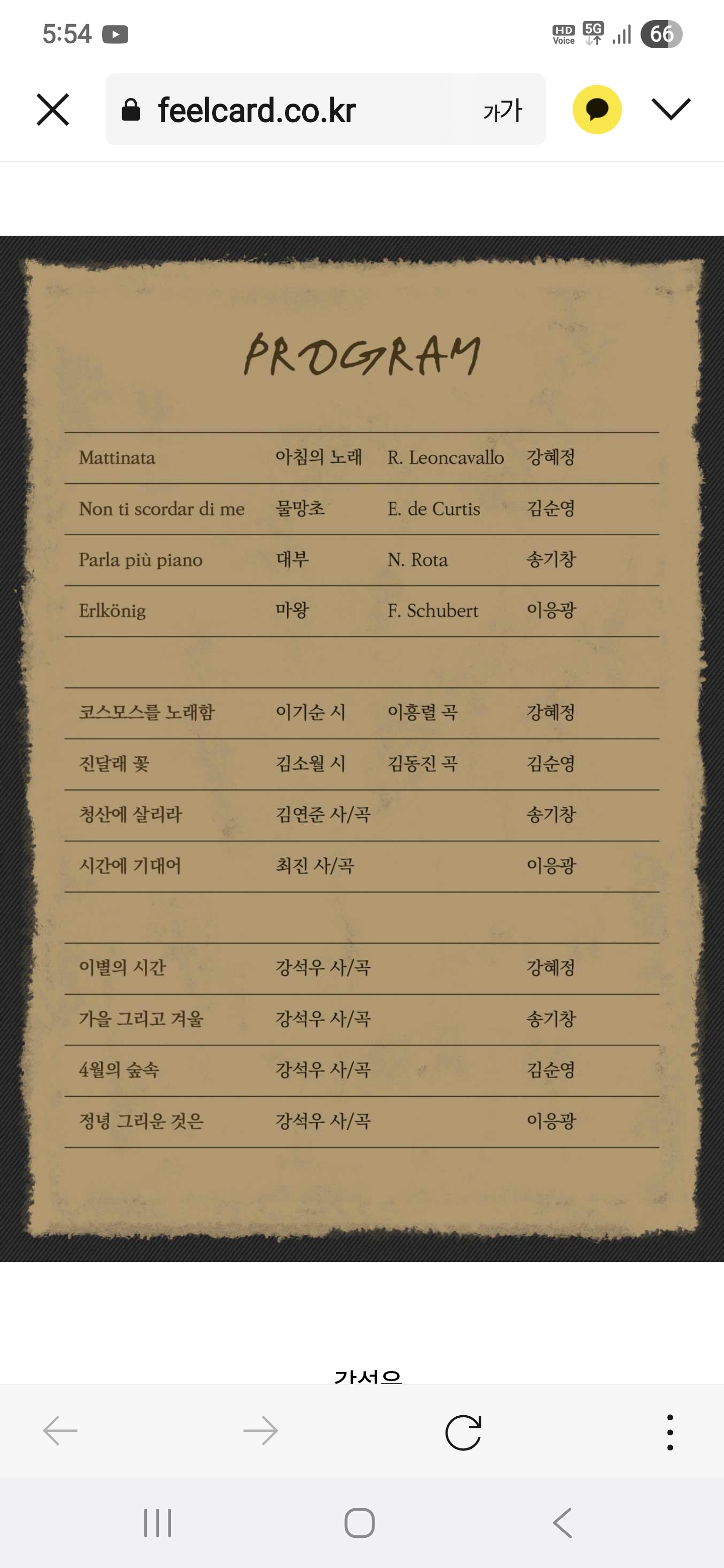 12개 선정 곡들을 각 성악가가 네 곡씩 번갈아 부르며 인터미션 없이 두 시간 가까이 이어졌지만, 지루함보다는 몰입의 밀도가 점점 깊어졌다.