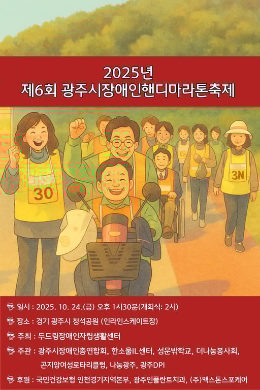 두드림장애인자립센터(센타장 김진관)는 오는 10월 24일(금) 오후 1시 30분, 경기 광주시 청석공원 인라인스케이트장에서 ‘2025년 제6회 광주시 장애인 핸디마라톤 축제”를 개최한다고 밝혔다.