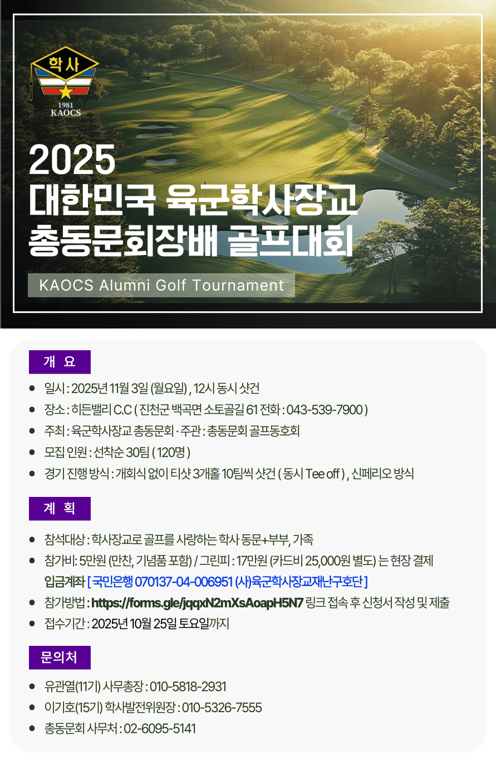 대한민국 육군 학사장교 총동문회(회장 권오길)는 오는 11월 3일(월) 충청북도 진천군 소재 히든밸리 C.C에서 ‘2025 대한민국 육군 학사장교 총동문회장배 골프대회’를 개최한다고 밝혔다.