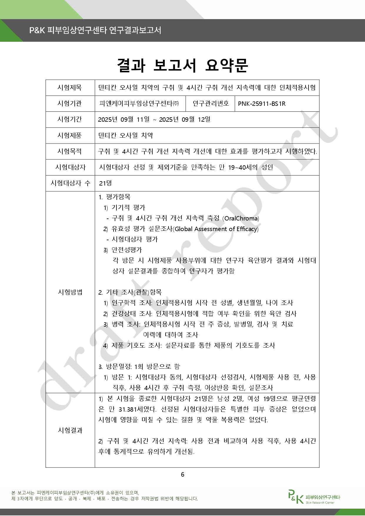 피엔케이피부임상연구센타(주)는 지난 9월 24일 (주)케이엔칸에서 의뢰한 덴티칸 오사일 치약의 구취 및 4시간 구취 개선 지속력에 대한 인체적용시험을 위탁받아 피엔케이피부임상연구센타 표준시험방법(SOP)에 따라 성실히 수행한 결과 보고서를 내놨다.