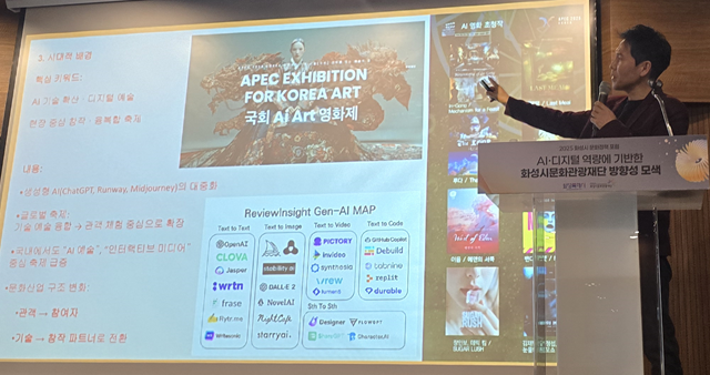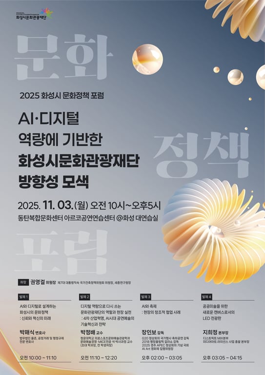 이번 포럼은 ‘AI·디지털 역량에 기반한 화성시문화관광재단의 방향성 모색’을 주제로, AI와 디지털 기술이 지역 문화·예술 정책에 미치는 영향을 다각도로 분석하고 미래지향적 문화정책의 비전을 제시한 자리였다.
