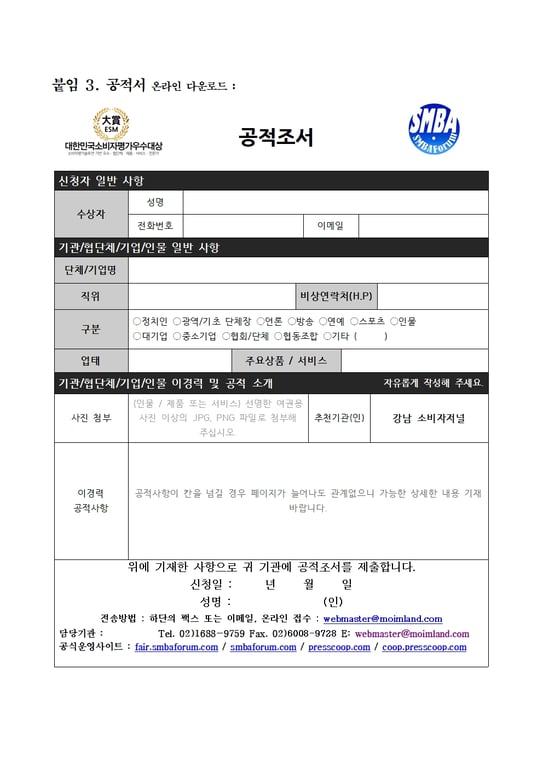 ※하단에 있는 붙입3_공적조서를 다운 받으셔서 webmaster@moimland.com으로 보내주시면 됩니다.