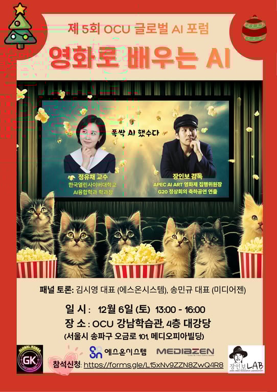 12월 6일(토)OCU 송파캠퍼스 4층 대강당에서 ‘영화로 배우는 AI’ 스페셜 강연 & AI 포럼을 개최한다고 밝혔다. 이번 행사는 AI 기술을 영화를 통해 쉽고 재미있게 이해할 수 있도록 구성된 시민 참여형 스페셜 강연으로, 영화감독 장인보 AI융합센터장이 연사로 나선다.