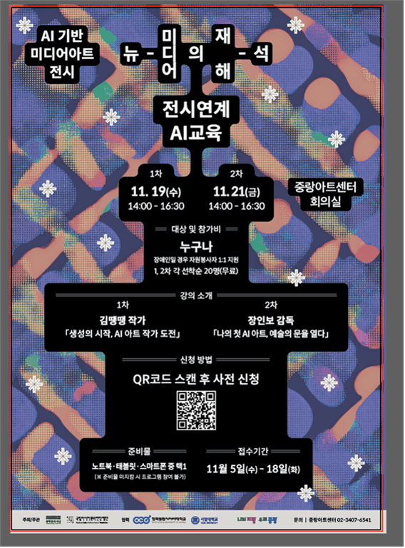 이번 강연은 지난 10월 개막 이후 큰 화제를 모으고 있는 미디어아트 전시 **《뉴-미디어의 재해-석》**의 전시 연계 교육 프로그램의 일환으로, AI 시대의 예술을 어떻게 이해하고 활용할 것인지에 대한 깊이 있는 통찰을 제공할 예정이다.
