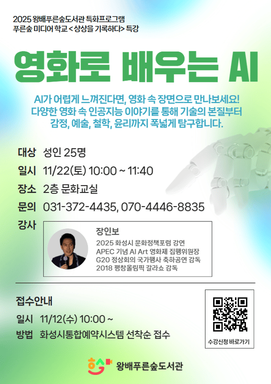화성시는 시민들이 일상 속에서 쉽게 인공지능(AI)을 이해하고 경험할 수 있도록, 오는 11월 22일(토) 오전 10시, 왕배푸른숲도서관에서 ‘영화로 배우는 AI’ 특별 강연을 개최한다고 밝혔다. 이번 강연은 2025 왕배푸른숲도서관 독화프로그램이자, 푸른숲 미디어학교 <상상을 기록하다> 특강의 일환으로 진행된다.