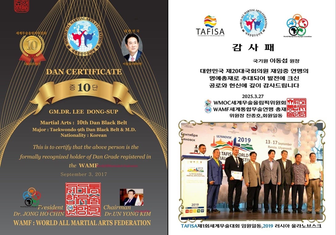 이동섭 국기원장은 세계통합무술연맹(WAMF) 으로부터 명예 10단 단증과 함께 총재급 감사패를 수여받았으며, 제20대 국회의원 시절 ‘태권도 진흥법’을 통과시켜 태권도를 국기로 지정한 주역이자 트럼프 명예위원장의 도복 착용 지도와 외교 의전을 총괄한 인물로 ‘태권도 대통령’이라 불린다.