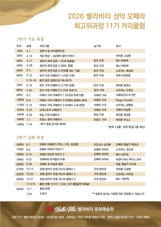 10기가 무대 위에서 한 해의 배움을 완성하는 이때, 벨라비타는 이제 2026년 성악·오페라 최고위과정 11기 원우를 새롭게 맞이할 준비를 하고 있다.