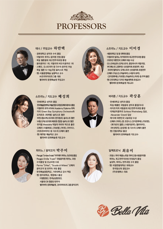 정상급 성악가들과 함께하는 품격 있는 무대, 벨라비타 교수진도 함께한다. 주임교수 테너 하만택, 바리톤 곽상훈 교수,소프라노 이미경 교수