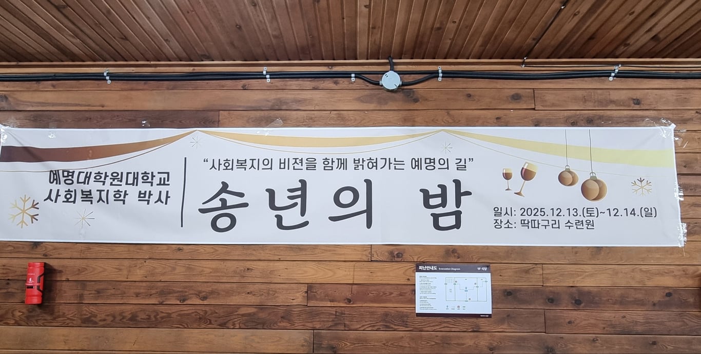 예명대학원대학교 사회복지학박사 동문회는 지난 12월 13일부터 14일까지 1박 2일간 딱따구리 수련원에서 ‘사회복지의 비전을 함께 밝혀가는 예명의 길’을 주제로 송년의 밤 행사를 개최했다. 이번 행사는 동문 간 소통과 연대를 강화하고, 사회복지 전문가로서의 사명과 역할을 재확인하는 자리로 마련됐다.