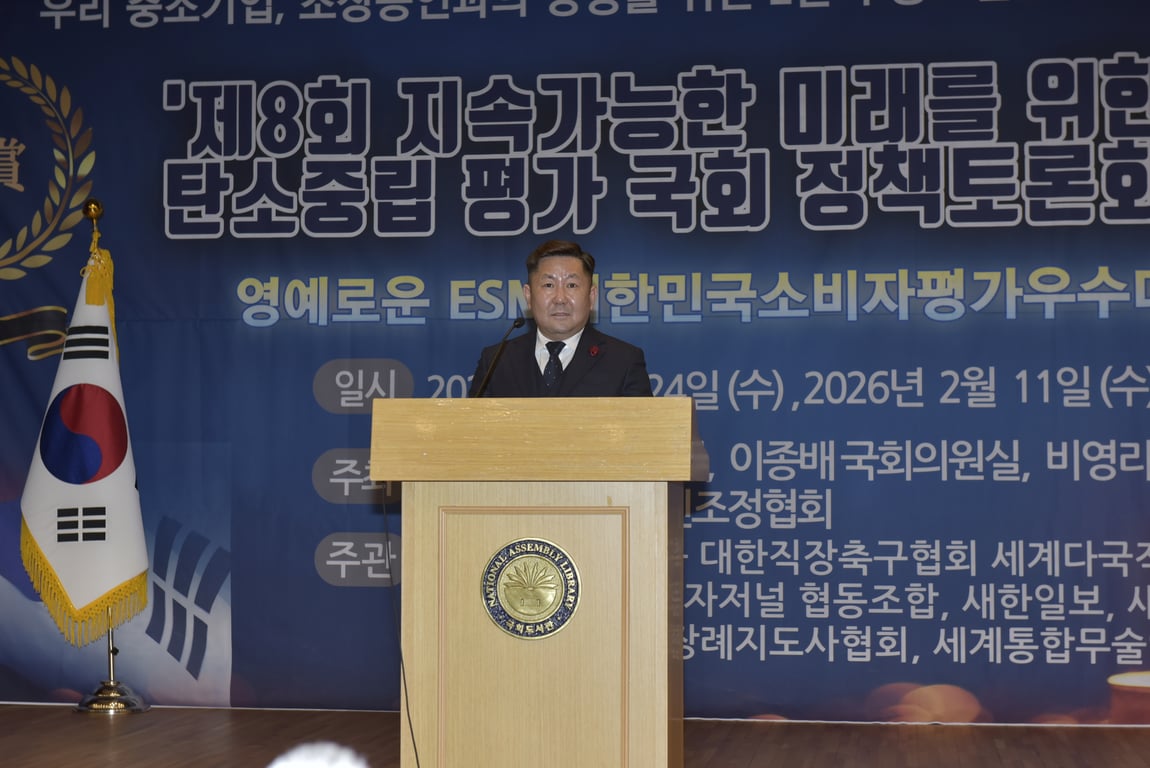 ▲사진=제8회 지속가능한 미래를 위한 기후변화 대응과 탄소중립 평가 국회정책토론회에서 축사하고 있는 박기훈 이사장 ⓒ강남 소비자저널