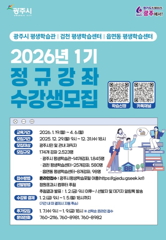 [강남 소비자저널=정현아 기자] 광주시는 12월 29일부터 31일까지 평생학습관, 검천평생학습센터 및 읍면동 평생학습센터에서 운영하는 2026년 제1기 평생학습 프로그램 수강생을 모집한다고 26일 밝혔다.
