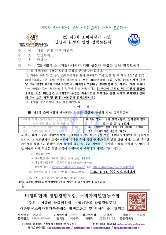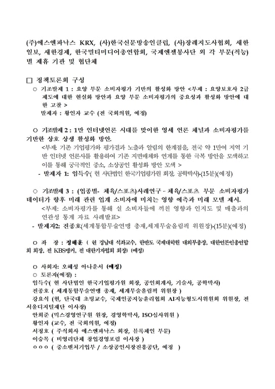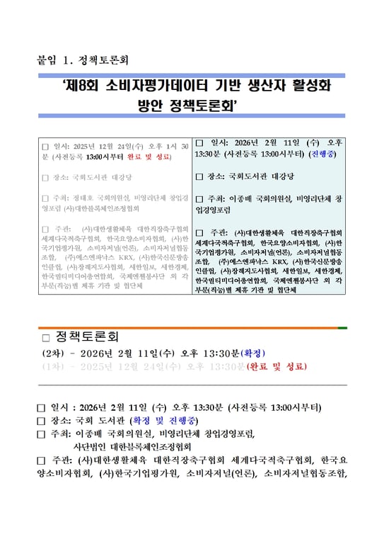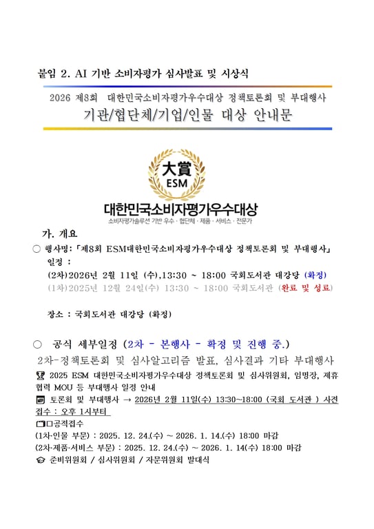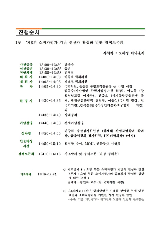 2차 정책토론회에서는 제8회 대한민국소비자평가우수대상시상식이 추가돼 국회의원, 시도지사, 군수 등 정치인은 물론 우수한 기업들이나 단체 등이 대거 수상 및 참석할 것으로 예상된다.