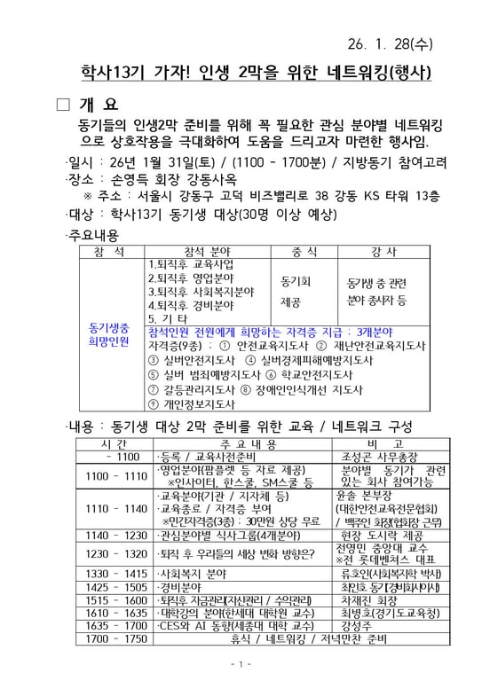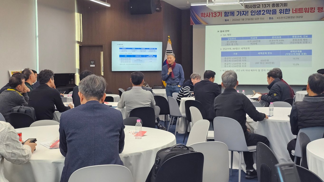 학사장교 13기 총동기회는 1월 31일(토) 오전 11시부터 오후 5시 30분까지, 서울 강동구 고덕 KS타워에 위치한 KS한국고용정보 대회의실에서 ‘학사13기 함께 가자! 인생 2막을 위한 네트워킹 행사’를 성공적으로 개최했다.