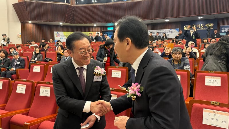 ▲사진=행사에 앞서 이종백 국회의원(좌)과 정태호 국회의원이 웃으며 악수하고 있다 ⓒ강남 소비자저널